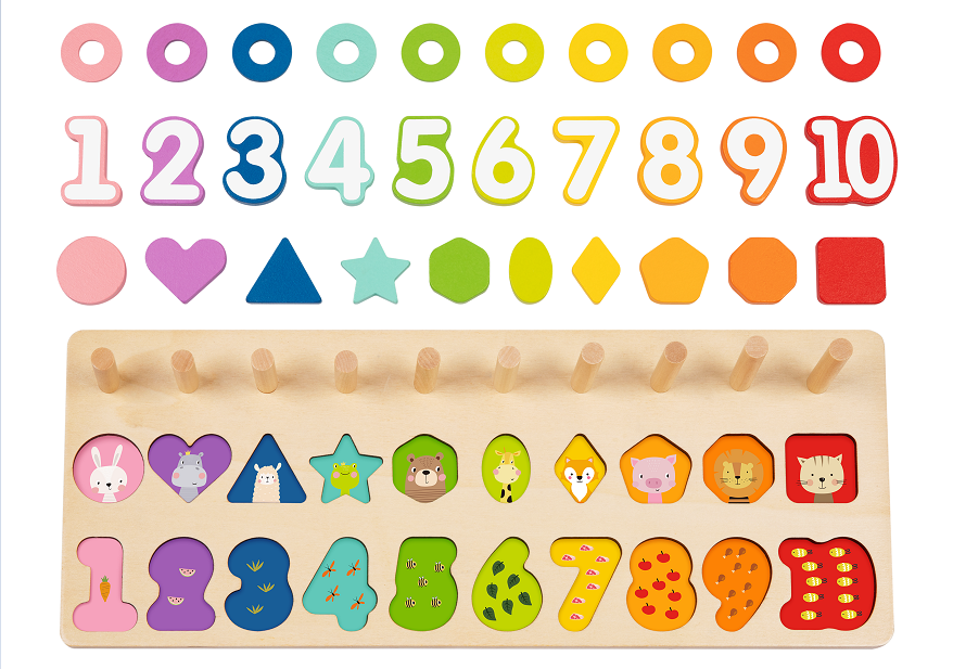 Contém: 1 tabuleiro com 10 pinos verticais fixos, 55 discos coloridos de encaixar neles, 10 números grossos (1 a 10) com rebaixos no tabuleiro para encaixar, 10 formas geométricas grossas (idem rebaixos), totalizando 76 peças conforme imagens (todas essas peças são de madeira !).